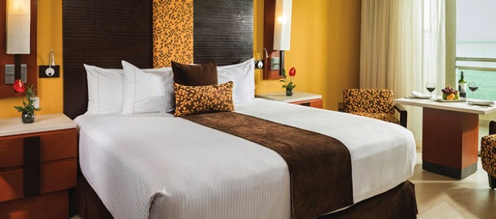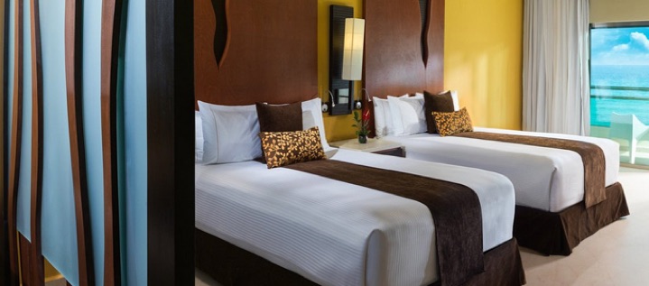 Generations Riviera Maya features 144 luxurious suites decorated in a forward looking style and divided into 10 categories. All accommodations are provided with deluxe amenities including 24 hour in room dining, oversized balcony or terrace, Jacuzzi for two, 47” LCD TV, and iPod docking alarm clock. Additional room comforts include AC, bathrooms with double sinks, hair dryer, plush bath robes, either one king or two double beds, safety deposit box, iron and ironing board, coffee maker, telephone, a vanity mirror and ample closet space. In room mini fridge customizable with beverage choices and sweet and savory snacks, plus kid’s favorites. Guests traveling with children can take advantage of our Karisma Gourmet Inclusive® Experience baby amenities such as strollers, cribs, pack and plays, baby changing tables, monitors, baby bottle warmers, baby bathrobes and more. Enjoy the astonishing views of the turquoise Mexican Caribbean Sea from all our beachfront rooms.